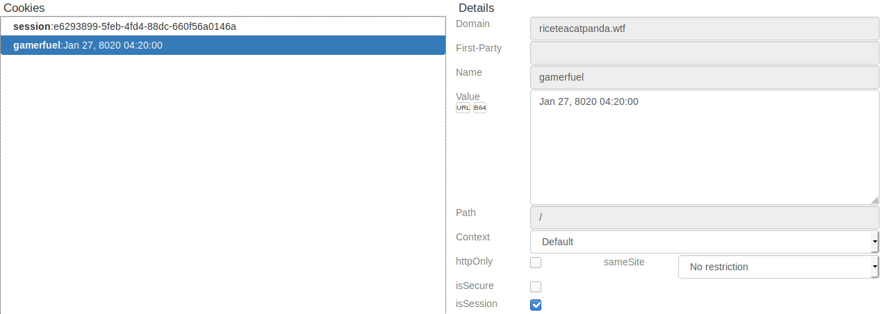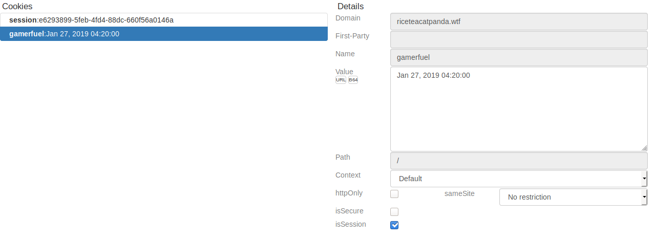 In this challenge, we’ll be using a Firefox extension called Cookie Quick Manager to manipulate our browser’s cookies. If we open the extension and search for cookies related to the RiceTeaCatPanda domain, we quickly see: