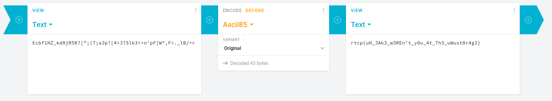 While there are command-line tools designed for making sense of Base85, we’ll make use of cryptii.org, a phenomenal website for quickly encoding/decoding messages.